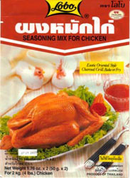 Lobo offers you a traditional seasoning mix, good for baking, frying or charcoal grill. Dissolve in water and marinate a whole chicken, or parts, for one hour. Bake, grill or deep fat fry for Thai style BBQ chicken. Serve with sticky rice. See a recipe for Thai Barbeque Chicken.
