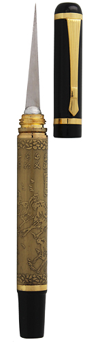 Our elegant Black and Gold Pen Style Thai Carving Knife is our luxury fruit and vegetable carving knife. Designed like a pen with an elegant black with gold clip screw-on-cap, the handle is covered in an embossed golden Chinese design. This handsome, artisan made pen-style Thai knife has a super flexible and incredibly sharp thin blade similar to our Thai Flexible Carving Knife (above).